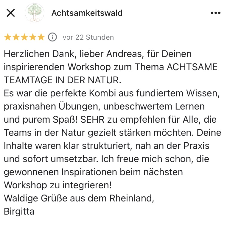 Gerne erstelle ich Ihnen ein individuelles Resilienztraining für Ihr Unternehmen / Ihre Organisation / Ihren Verein. In einem Vorgespräch klären wir Ihre Wünsche und Anforderungen, legen Inhalte und Zielgruppen fest, vereinbaren Rhythmus, Dauer und Ort. Es kann auch Teil der betrieblichen Gesundheitsförderung sein und lässt sich gut mit Kommunikationstraining und Waldbaden als achtsamen, und stresspräventivem Naturerlebnis verbinden.